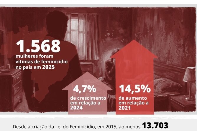O Brasil registrou 6.904 vítimas de feminicídio consumado e tentado em 2025 – um aumento de 34% em relação a 2024, quando houve 5.150 vítimas. Foram 4.755 tentativas e 2.149 assassinatos, o equivalente a quase seis (5,89) mulheres mortas por dia no país.